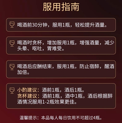o 酒前服用1瓶,护肝护胃解酒,可明显改善酒量;